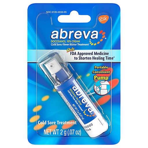 Abreva Docosanol 10% Cream is a cold sore treatment that acts fast to tackle cold sores at their source. Formulated with Docosanol 10%, this fever blister and cold sore medication helps to shorten the duration of tingling, pain, burning and itching associated with cold sores if used as directed at the first sign of a tingle. Unlike other cold sore remedies that just soothe symptoms, Abreva has docosanol, an antiviral that works to block the virus from infecting healthy cells. Abreva Cream is the only nonprescription cold sore medicine approved by the FDA to shorten healing time (1). This healing cream should be applied 5 times a day until your cold sore is fully healed, for a maximum of 10 days. This Abreva Docosanol 10% Cream pump bottle is easy to apply and the convenient three pack allows you to take one with you on the go.(1) When used at the first sign