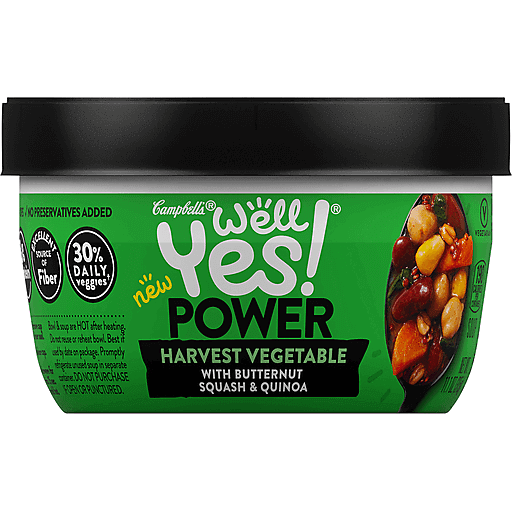 Harvest vegetable with butternut squash & quinoa. No artificial flavors. 190 calories per container. 8 g protein. Excellent source of fiber. 30% daily veggies (0.75 cups of vegetables per serving. Dietary guidelines recommend 2-1/2 cups of a variety of vegetables per day for a 2,000 calorie diet). Vegetarian. Contains bioengineered food ingredients. The ingredients from canola and and soy in this product come from genetically modified crops. New. Live well. Eat bright. No preservatives added. Microwave safe. campbells.com. how2recycle.info. Questions or comments? 1-800-257-8443 campbells.com/well-yes.