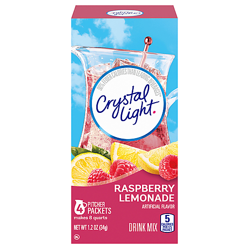 Crystal Light Raspberry Lemonade Powdered Drink Mix is a refreshing beverage you can enjoy at any time of day. With zero grams of sugar and only 5 calories per serving, Crystal Light is a sweet alternative to juice and soda and has 90 percent fewer calories than leading beverages (this product 5 calories, leading beverages 70 calories), so you dont have to choose between taste and calories. Classic lemonade with raspberry flavoring offers a refreshingly smooth taste. Each packet of powdered lemonade mix in this four pack is perfectly portioned to make 2 quarts or 1 pitcher of Crystal Light lemonade, so theres plenty to share with family and friends. Simply mix one lemonade packet with 8 cups or 2 quarts of water, stir, and enjoy! All the flavor and only 5 calories... just the way you like it.
