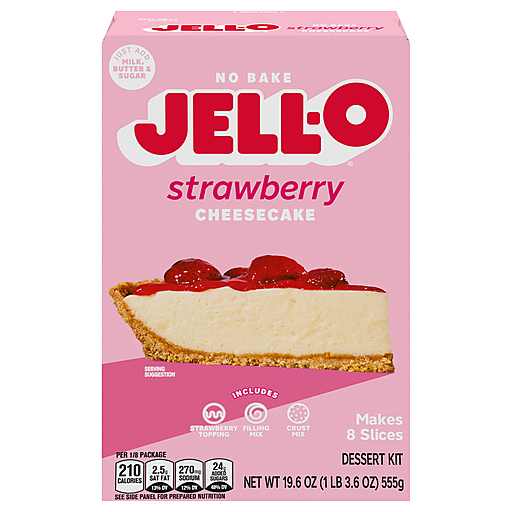 Take a break from your oven with a delightful cheesecake that's ready in 15 minutes with no baking required. Our Jell-O No Bake Strawberry Cheesecake Dessert Kit offers the rich and creamy flavor of traditional cheesecake without the need for an oven. Each box contains strawberry topping, filling mix and graham cracker crust mix. Simply add milk, butter and sugar for a classic cheesecake with a rich, velvety texture and fruity strawberry topping. Since our strawberry dessert mix requires minimal prep time, you'll spend less time in the kitchen and more time with your family or guests. Our creamy, no-bake cheesecake is perfect for holiday gatherings, parties, picnics or any time you want to prepare a decadent dessert quickly. Each 19.6-ounce box makes eight servings, perfect for your entire family to enjoy. You can also use our kit to make dessert bars by preparing as directed and using an 8-inch square pan. Enjoy a slice of your favorite dessert anytime with our no-bake cheesecake mix.